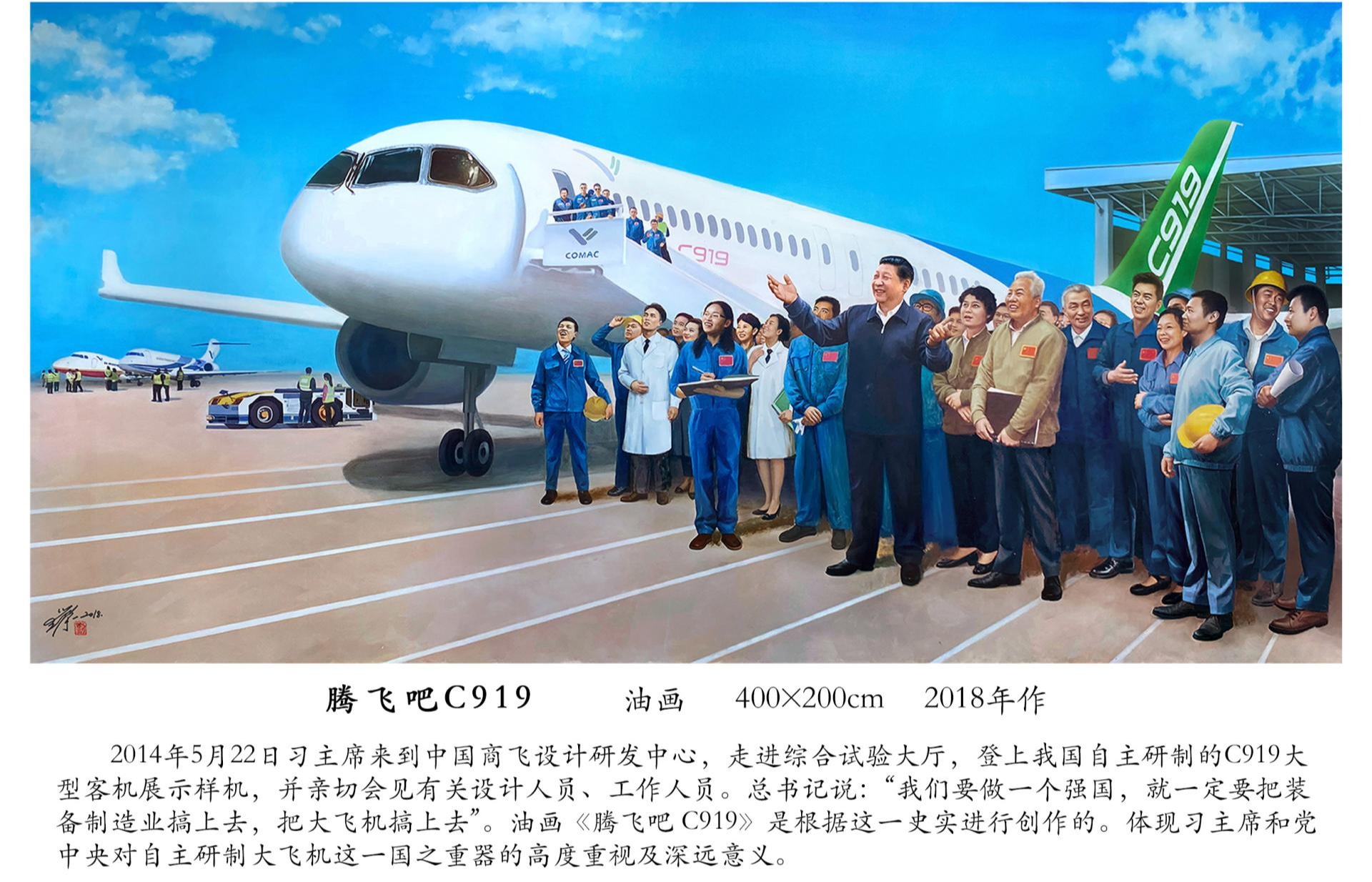 刘宇一教授创作的《腾飞吧C919》在本次画展中参展。2014年5月22日习主席来到中国商飞设计研发中心,走进综合试验大厅,登上我国自主研制的C919大型客机展示样机,并亲切会见有关设计人员、工作人员。总书记说:“我们要做一个强国,就一定要把装备制造业搞上去,把大飞机搞上去”。油画《腾飞吧C919》是根据这一史实进行创作的。体现习主席和党中央对自主研制大飞机这一国之重器的高度重视及深远意义。