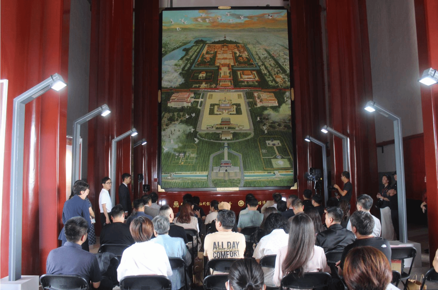 巨幅油画《壮美中轴》是由北京京企中轴线保护公益基金会发起邀请、北京市文物局审批支持刘宇一教授为主要创作人。该作品长7.8米,宽5.6米,分别象征了北京中轴线的长度7.8公里,56个民族的团结一心。画面中运用了中线对称的竖线构图方法,描绘了古代皇城,包括天安门广场、天安门、人民大会堂、国家博物馆等当代重要建筑。