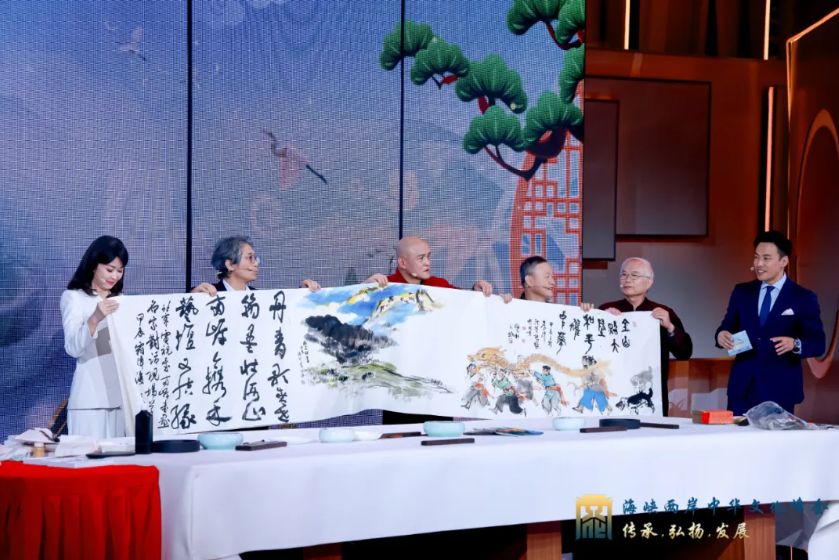 在活动的最后一个单元,中国国家画院一级美术师、中国国家画院国画院研究员史国良,中国人民大学艺术学院教授、郑州大学书法学院院长郑晓华,台湾文联台湾书法家协会会长沈荣槐,台湾中国美术协会理事长李沃源等四位书画名师现场共绘长卷,抒发“两岸一家亲”“两岸书画同根同源”的同胞情怀。