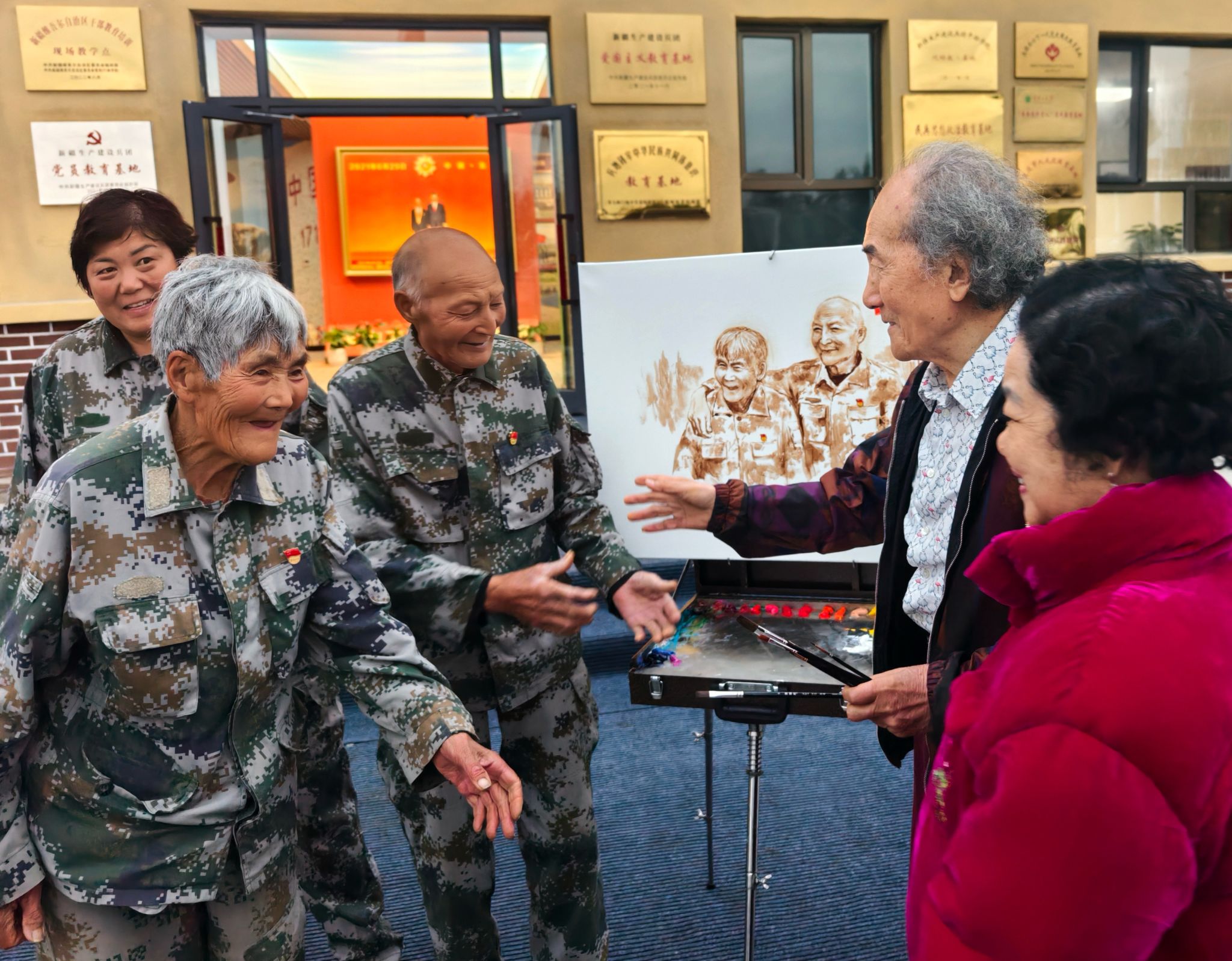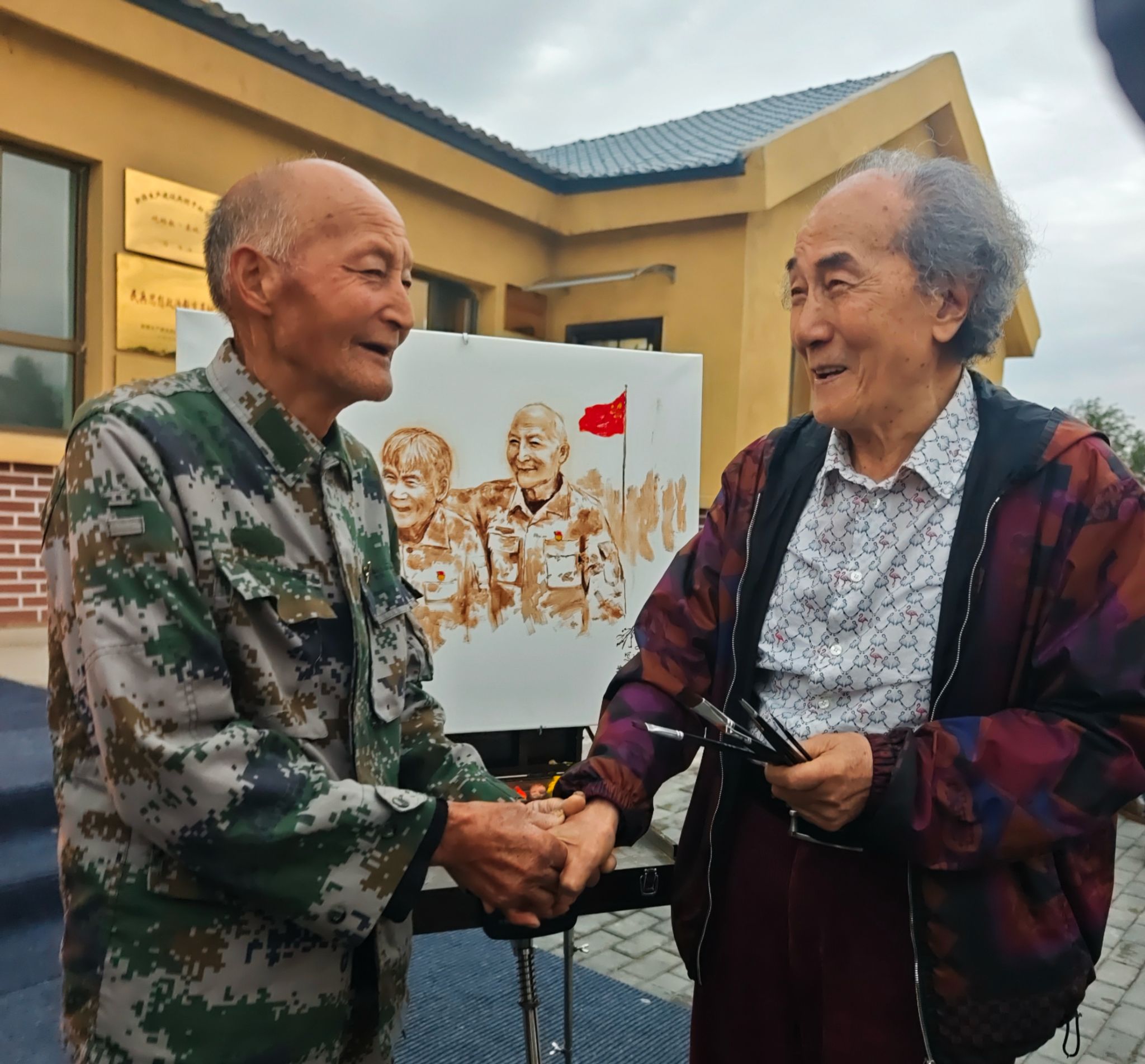 刘宇一院长为七一勋章获得者、戍边老英雄魏德友夫妇画像后,互致祝福