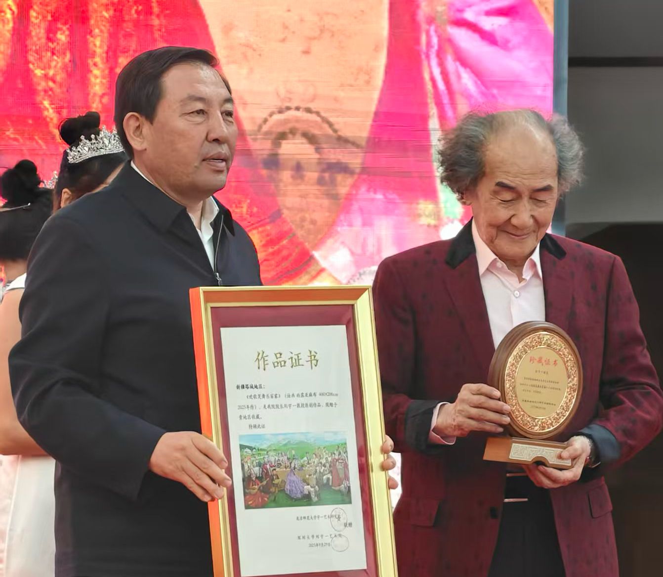刘宇一院长和行署专员阿依丁·托留汗交换捐赠作品证书和珍藏证