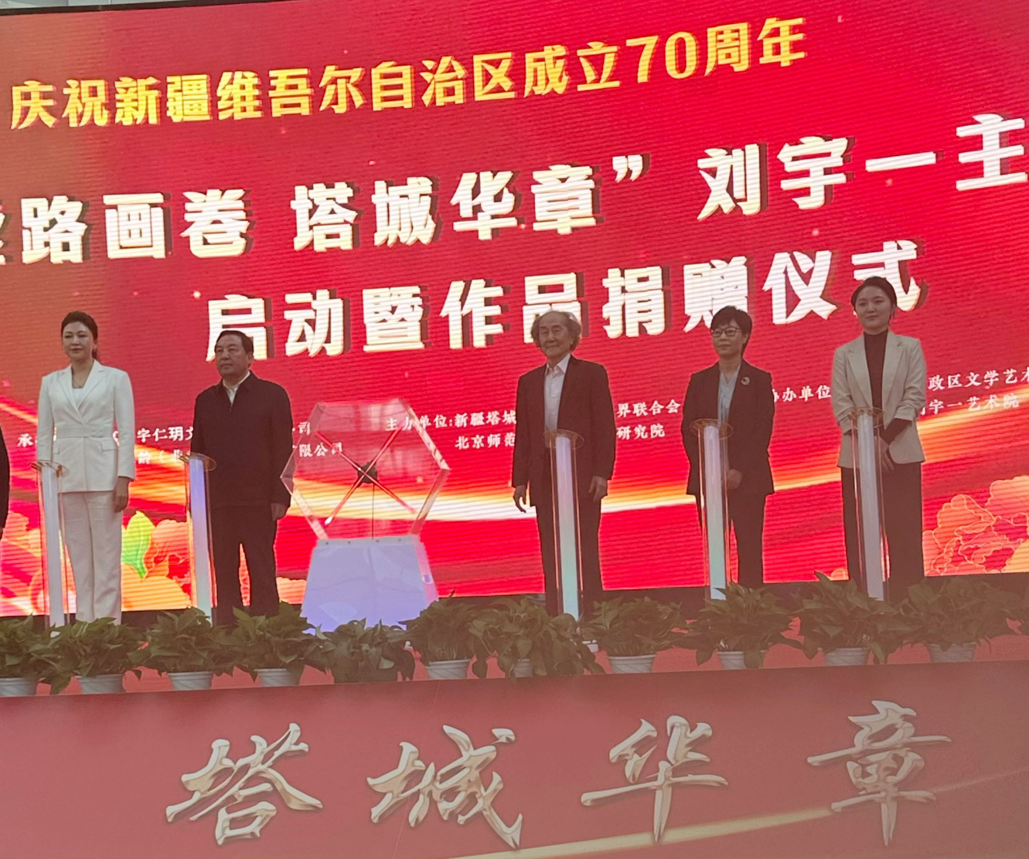 9月29日上午10:30分,塔城地区新时代文明实践中心展厅举办 “丝路画卷 塔城华章——刘宇一主题画展” 启动暨作品捐赠仪式,为新疆维吾尔自治区成立 70 周年献上了一份文化厚礼。画展共展出刘宇一作品 92 幅,展期至10月31日,方便群众游客观展。