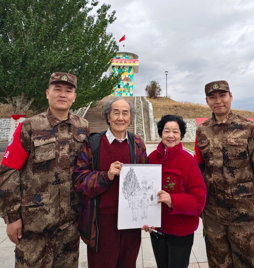 刘宇一院长为青年戍边卫士在小白杨哨所画速写后合影留念