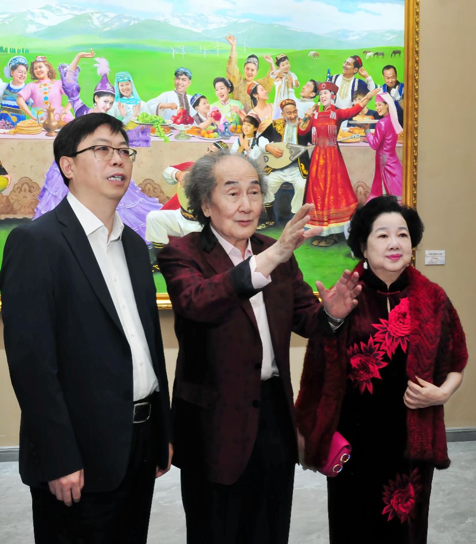 此次画展的最大亮点是刘宇一院长为塔城创作的大型油画《欢歌笑舞乐百家》。9 月 28 日,画展开放前一天,院长亲赴展厅对作品进行最后调整。