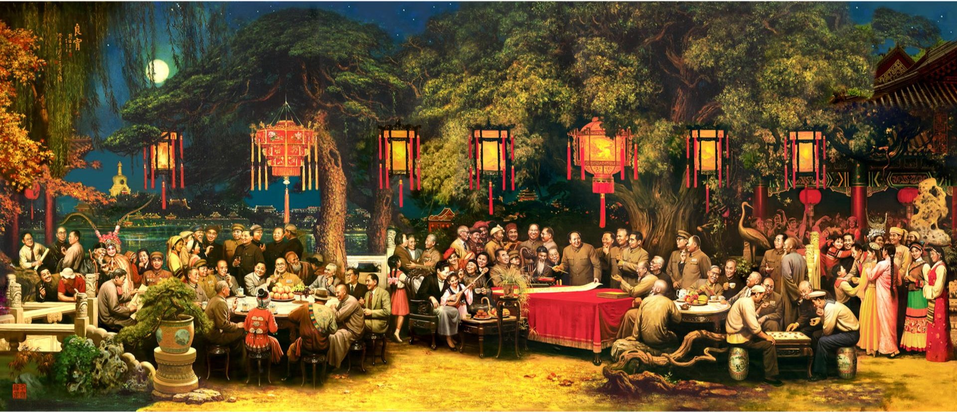 作者以1950年国庆、中秋之夜,毛泽东主席与民主人士柳亚子先生和词《浣溪沙》为主题,描绘各族各界百余人士在皓月明媚、宫灯高悬的中南海庭院里,开怀题诗唱词、品茗弈棋、歌舞蹁跹的欢乐情景。展示经历百年苦难的旧中国迎来了初步繁荣安定的新中国。