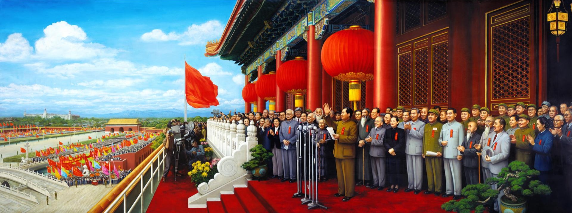 此作记载了发生在天安门城楼上的共和国重大历史事件——1949年10月1日毛主席向全中国、全世界人民庄严宣告:“中华人民共和国成立了!”“中国人民站起来了!”。在天安门城楼上参加盛典的有662位各界人士,毛主席称他们为“开国元勋”,并命名这份名单为“天书”。列夫·托尔斯泰曾说:“艺术不是技艺,它是艺术家体验了的感情传达”。